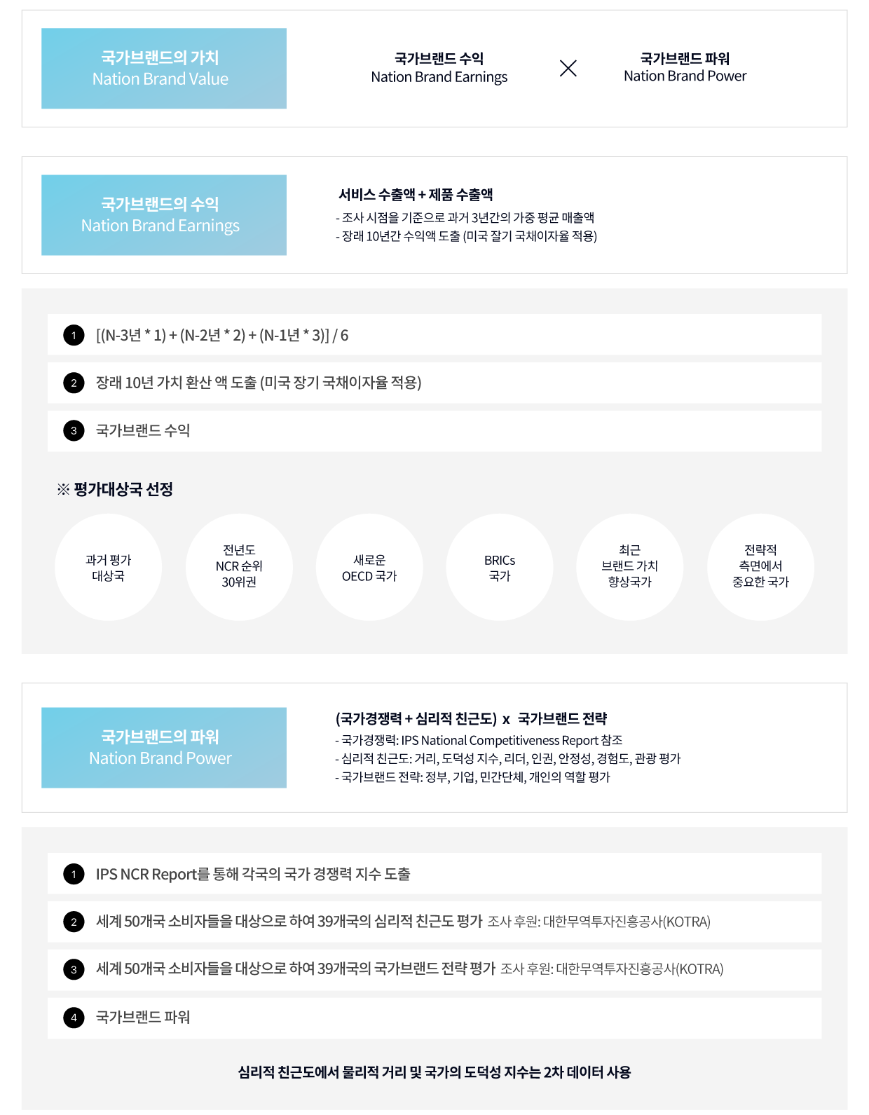 본원의 국가 브랜드 가치평가 결과는 세계 60여개국 2,000여 명을 대상으로 조사한 심리적 친근도, 국가 브랜드 활동주체 평가 결과와 IPS 경쟁력지수, 각 국가의 제품 및 서비스 수출액 등을 반영하여 산출됩니다. 이러한 평가 결과를 토대로 차별적, 전략적 강화 방안을 모색하고 체계적이고 거시적인 국가 브랜드 가치제고 전략을 제시하고자 합니다.